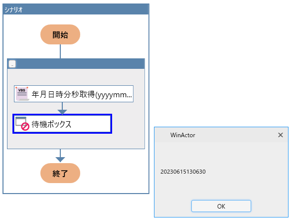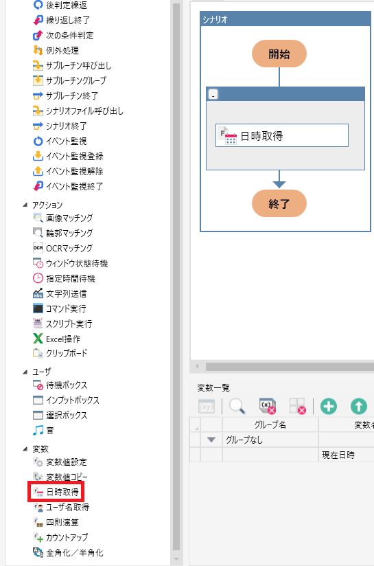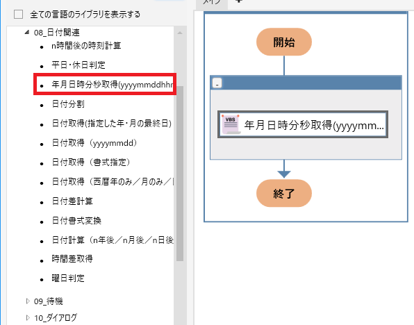 「08_日付関連\年月日時分秒取得(yyyymmddhhmmss)」ライブラリをシナリオの中に置きます。