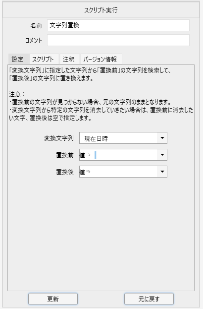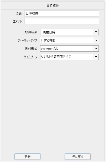 変換文字列:取得した現在日時を格納する変数を指定します。
