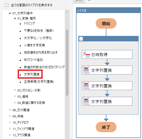 「07_文字列操作\01_変換・整形\文字列置換」ライブラリを三個シナリオの中に置きます。