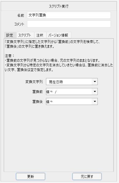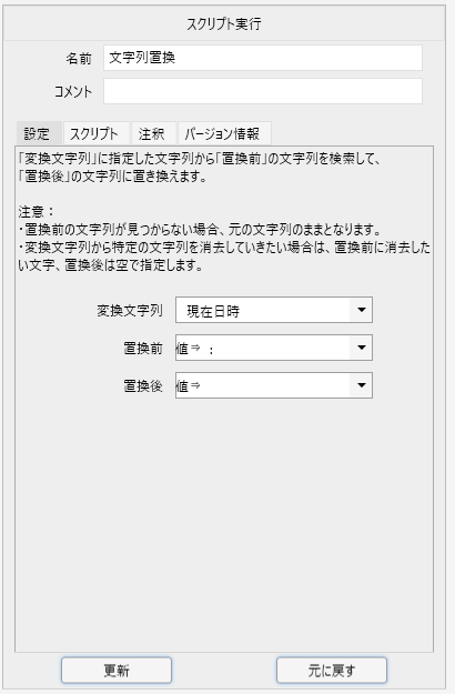 「日時取得」ノードで日時を取得した後「文字列置換」ライブラリで余計な区切り文字「/」「:」「 (半角スペース)」を消去します。