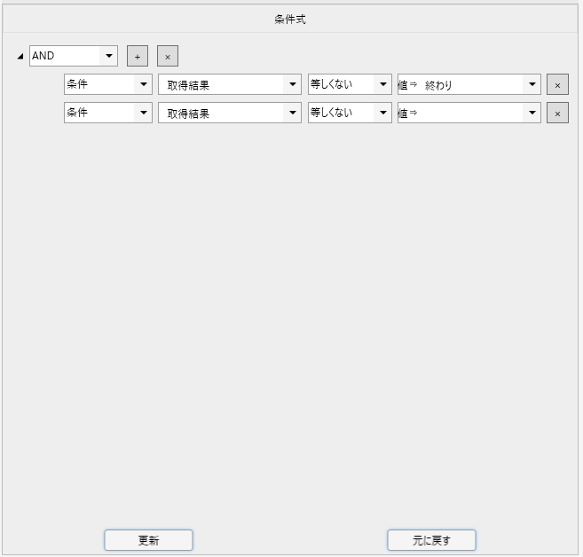 取得結果が空文字か値「終わり」の場合に繰り返しを終了するよう条件を指定します。